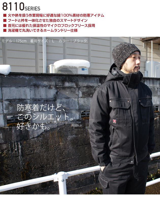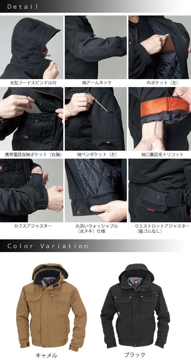 適応サイズ表(cm) サイズ バスト 肩幅 袖丈 着丈 M 110 48 60 63 L 118 52 61 66 LL 124 54 62 69 3L 130 56 63 72 4L 142 60 67 74 5L 148 62 67 74 商品詳細 メーカー名 バートル(BURTLE) 品番 8110 商品名 【バートル】【秋冬作業服】防寒ジャケット(大型フード付) 8110 素材 チノクロス、撥水加工(アクアトップ) 混率 綿100% 特徴 1:大型フードスピンドル付 2:カフスアジャスター 3:袖口裏起毛トリコット 4:袖アームタック 5:丸洗いウォッシャブル(水ヌキ)仕様 6:ウエストロットアジャスター(脇ゴムなし) 7:携帯電話収納ポケット(右胸) 8:内ポケット(左) 9:袖ペンポケット(左) サイズ S・M・L・LL・3L・4L・5L カラー キャメル(24)・ブラック(35) こちらは【3L】の販売ページです。